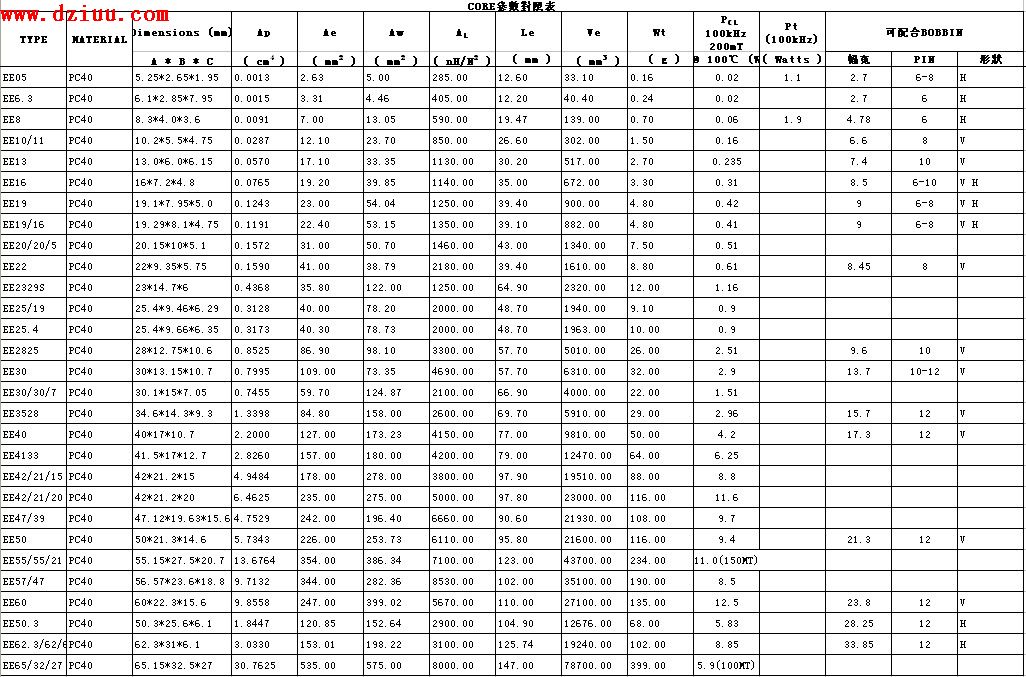 ee型磁芯參數.磁芯尺寸資料