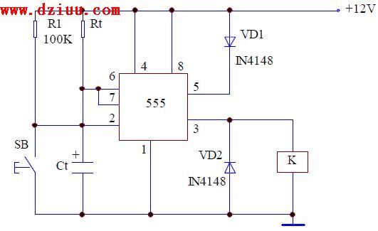 當(dāng)按下按鈕SB 時(shí),12V 的電源通過電阻器Rt 向電容器Ct 充電,使得6 腳的電位不斷升高,當(dāng)6 腳的電位升到5 腳的電位時(shí),電路復(fù)位定時(shí)結(jié)束。 在5 腳串上了一個(gè)二極管