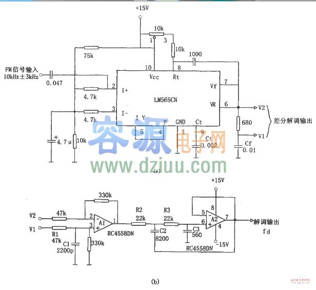 電路采用LM565CN構成10kHz±3kHz的調頻解調電路。《版權聲明:本文由容源電子網(www_dziuu_com)整理提供,部分內容來源于網絡,如有侵犯到你的權利請與我們聯系更正。》