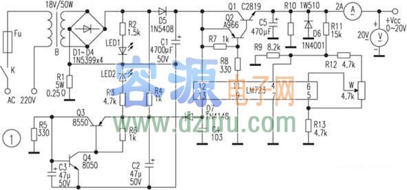 閃亮,調(diào)節(jié)電位器W可使輸出電壓在0~20范圍內(nèi)調(diào)節(jié)。 <<版權(quán)聲明:本文由容源電子網(wǎng)(www_dziuu_com)整理提供,部分內(nèi)容來源于網(wǎng)絡(luò),如有侵犯到你的權(quán)利請與我們聯(lián)系更正。》