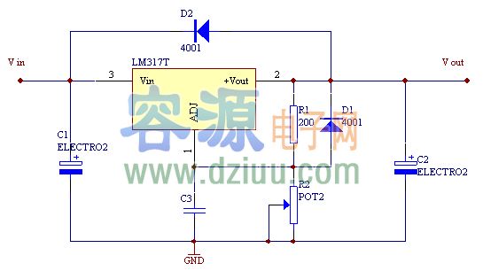 LM317集成可調穩壓電源接線圖 <<版權聲明:本文由容源電子網(www_dziuu_com)整理提供,部分內容來源于網絡,如有侵犯到你的權利請與我們聯系更正。》