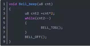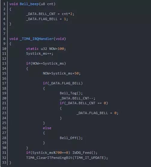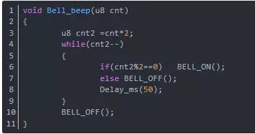 2、函數(shù)體變了,這里改成了兩個(gè)變量的賦值,第一個(gè)BELL_CNT同普通方法中的cnt2,這里不再贅述。第二個(gè)是FLAG_BELL是用來(lái)保存蜂鳴器是否需要驅(qū)動(dòng)的狀態(tài)變量。所以既然是調(diào)用驅(qū)動(dòng)函數(shù),那肯定這個(gè)變量要為真。