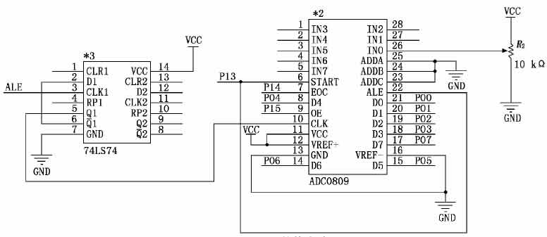 。粒霓D換器的時鐘脈沖為單片機ALE引腳輸出的脈沖經74LS74芯片分頻之后得到,A/D轉換器的8位數字信號通過單片機的P0口進行采集與處理。