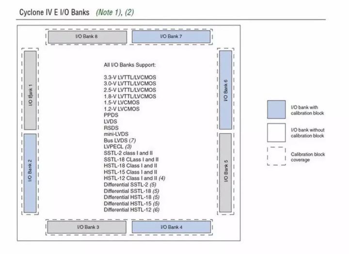 FPGA的IOE按組分類,每組都能夠獨立地支持不同的I/O標準,通過軟件的靈活配置,可匹配不同的電器標準與IO物理特性,而且可以調整驅動電流的大小,可以改變上/下拉電阻,CycloneIV設備有8個IOblank(組),見下圖: