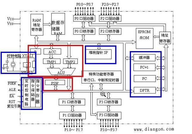 內部的結構看似十分復雜,但是大致上可以分為兩個部分:運算器(紅色框)和控制器(藍色框)。