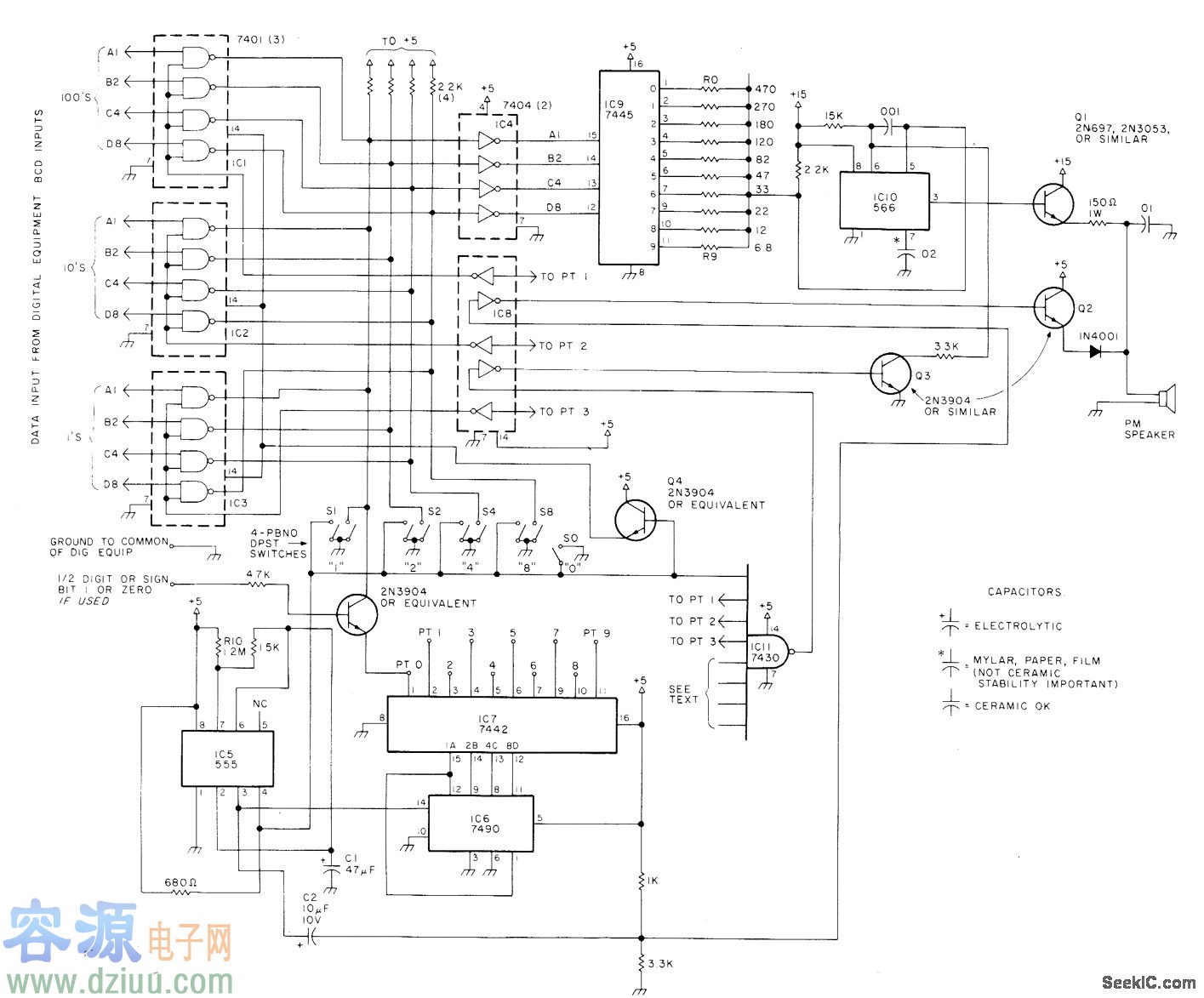 該電路將數字測試轉換為BCD輸入以適應0到9以串聯10個不同的音調序列,目的在于幫助盲人無線電操作者或實驗者識別數字顯示器顯示的讀數。音調序列的長度等于顯示的位數加上所需的標記指示或半數字。 :
