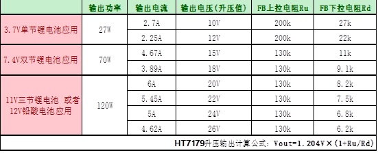 4.單節/雙節/三節鋰電或者鉛酸電池應用升壓輸出電壓/功率以及對應FB管腳設置電阻值: