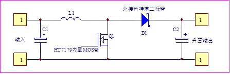 HT7179內部集成15A的MOS開關管,外圍除了必須的電感之外,關鍵器件就是肖特基二極管。原理上是一種常見的開關直流boost升壓DC-DC電路,它通過開關管導通和關斷來控制電感容-源-電-子-網-為你提供技術支持