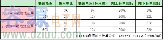 單節/雙節鋰電池應用升壓輸出電壓/電流/功率以及對應FB管腳設置電阻值: