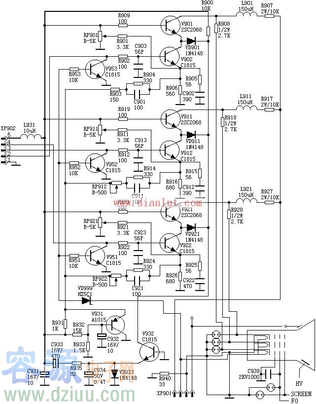 TDA6103內含三組視頻輸出放大器,視頻帶寬達7.5MHZ,內設過熱保護、防CRT跳火保護,圖為TDA6103在長虹D2191機型上的應用。 TDA6103的(1)、(2)、(3)腳為R、G、B輸入腳,(7)、(8)、(9)腳為R、G、B