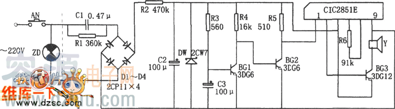 CIC2851E電冰箱關門提醒電路原理 該電路由降壓整流穩壓電路、延時電路、音樂集成電路CIC2851E、揚聲器等組成。其中降壓整流穩壓電路為整個電路提供3V左右的直流電壓。 當打開電冰箱門時,開關AN接通,電容