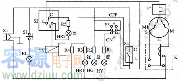 下圖所示的是長嶺-阿里斯頓BCD-203型雙溫雙控電冰箱電路。S2為冷藏室溫控器;S4為冷凍室溫控器;EL為照明燈,安裝在冷藏室的頂部,由冷藏室門開關S1控制;HY為黃燈速凍顯示,由速凍開關S3控制;HG綠燈是電源指示燈;HR1紅燈是冷凍室制冷顯示,S4或S3接通時該燈亮,HR2紅燈是冷蔵室制冷顯示,由S2控制;K是電流起動繼電器;YV為電磁閥;M為壓縮機電動機。