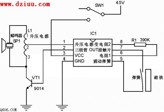 動、靜觸點(diǎn)斷開,起動報(bào)警,IC1收到報(bào)警信號后,經(jīng)R1振蕩電阻,在內(nèi)部產(chǎn)生音頻信號,經(jīng)信號輸出端,送入VT1,進(jìn)行功率放大,放大后的音頻信號經(jīng)升壓電感耦合,變成一個較高電壓的音頻信號,驅(qū)動蜂鳴器發(fā)出響亮的報(bào)警信號。