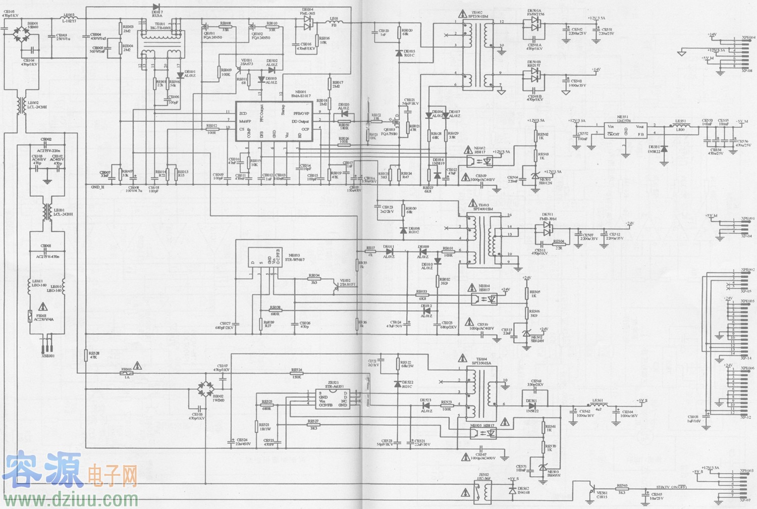 液晶電視電源主要由待機副電源、PFC(功率因數校正)電源、主電源、過壓過流過熱保護、開待機控制等電路組成,其輸出一般有24v、12V、5V等幾組電壓,由主板CPu控制其開/待