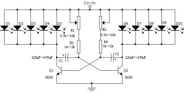 電路中都可以看到,本LED廣告彩燈電路采用兩只NPN三極管8050驅(qū)動多只LED組成,其工作原理是: