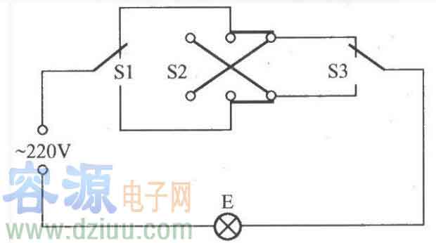 三控開關是指在三個不同地方都能各自獨立地控制同一盞電燈的點亮或熄滅,其電路如圖所示。圖中S1、S3為1×2單刀雙擲開關,S2則要用2×2雙刀雙擲開關。