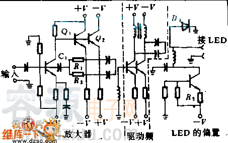 在模擬系統(tǒng)中,對(duì)LED的線性度要求很,但不同的LED線性度不同,且線性度又隨溫度變化而變化。本控制電路的LED驅(qū)動(dòng)器和信號(hào)放大電路能保持LED的線性度。放大器用一對(duì)互補(bǔ)晶體管Q1和Q2,用作進(jìn)一步降低二次失真。通