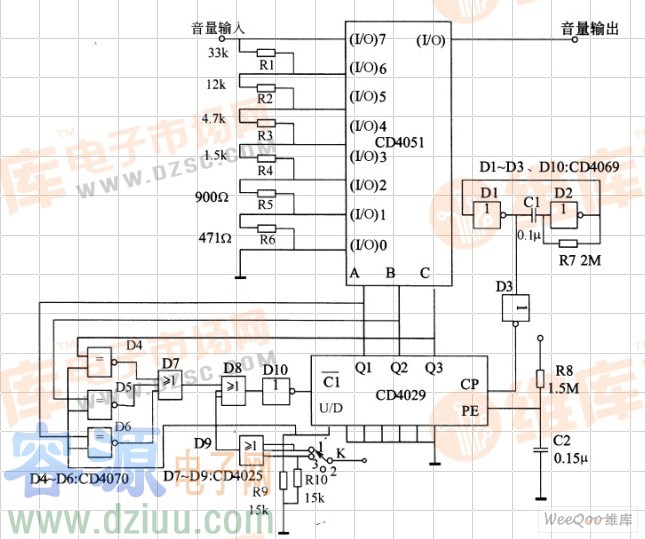 如圖1所示是由單八路模擬開(kāi)關(guān)CD4051、可預(yù)置可逆計(jì)數(shù)器CD4029、四導(dǎo)或門(mén)CD4070,三3輸入端或非門(mén) CD4025以及六反相器CD4069 組成的電位位控制電路,該電路主要用于音響設(shè)備中控制音量大小。圖1 電位控制電路