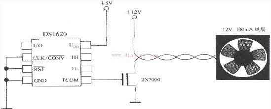 用DS1620監(jiān)控微處理器的溫度時(shí),通過(guò)開(kāi)啟或關(guān)閉風(fēng)扇,可改變芯片的散熱條件,實(shí)現(xiàn)恒溫控制,電路如圖所示。其特點(diǎn)是將TCOM信號(hào)經(jīng)過(guò)2N7000型MOSFET,去控制風(fēng)扇,當(dāng)芯片表面溫度t>tH時(shí)打開(kāi)