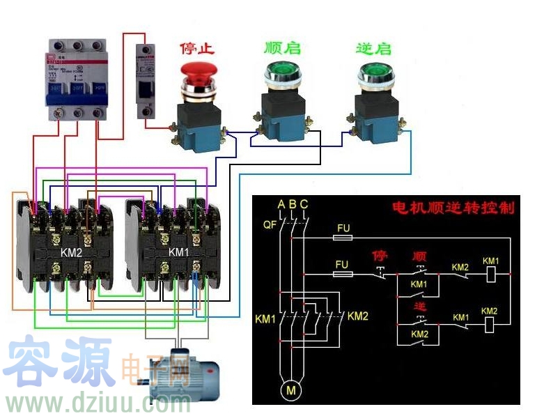有些朋友可能會(huì)問(wèn),從實(shí)物接線圖中,怎么知道按鈕開(kāi)關(guān)哪個(gè)是動(dòng)合開(kāi)關(guān),哪個(gè)是動(dòng)斷開(kāi)關(guān)呢。這個(gè)很簡(jiǎn)單,你只要觀察按鈕接線柱的高低就能分析出來(lái)。從上圖中,觀察停止按鈕,兩個(gè)接線柱高的就是動(dòng)斷開(kāi)關(guān)接線柱,正轉(zhuǎn)和反轉(zhuǎn)都是接在下面兩個(gè)接線柱上的。交流接觸器上的動(dòng)斷和動(dòng)合區(qū)分方法也很簡(jiǎn)單,還是看上下觸點(diǎn),最上面的接線柱就是動(dòng)斷開(kāi)關(guān),最下面的接線柱就是動(dòng)合開(kāi)關(guān)。