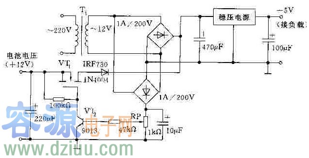 下圖是交直流入自動切換電路,市電電壓經變壓器T1降壓后,再經整流、濾波、穩壓后輸出,供負載工作。同時,另一路通過整流、濾波產生的直流電壓經RP分壓加到VT2的基極,VT2導通,VT1截止