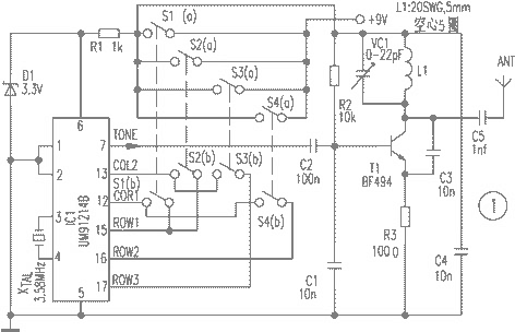 發送器電路由晶體管T1及其外圍電路組成,其中調諧電路L1和VC1調諧在100MHz載頻附近,天線用鞭狀天線,長10cm~15cm,控制范圍就相當不錯了。DTMF信號從IC1的{7}腳送入T1的基極,再由天線ANT向外發射。
