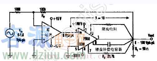 該高壓運(yùn)算放大器采用了一只ApexPB50Rooster放大器和一只集成電路運(yùn)算放大器。該電路把小的模擬信號(hào)變換成180Vyp信號(hào)。 :