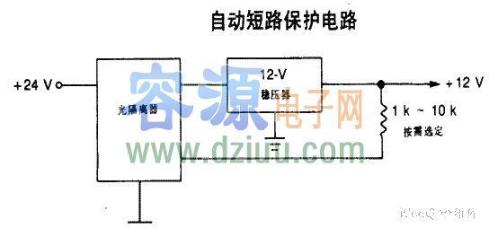 如圖為自動短路保護電路電路圖。 <<版權聲明:本文由容源電子網(www_dziuu_com)整理提供,部分內容來源于網絡,如有侵犯到你的權利請與我們聯系更正。》