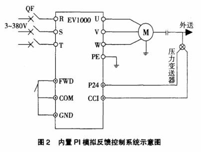 EV2000具有實用的PI(圖2),簡單的PLC,靈活的輸入和輸出端子,脈沖頻率參考,斷電和關斷參數存儲選項。頻率給定通道與運行命令通道捆綁在一起,零頻率間隙控制為設備提供了集成的集成解決方案,對降低系統成本和提高系統可靠性具有重要價值。 PI參數的設置將直接反饋變頻器控制中的響應速度和精度。零頻率操作閾值和零頻率滯后的設置可以防止變頻器在低頻輸出泵的低速運行(泵低于變頻器輸出15HZ)。效率非常低。當變頻器低于某一頻率時,輸出自動停止,即恒壓供水要求不受影響,效率最大化。
