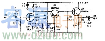 該電路的頻率響應范圍為100HZ~3MHZ,增量約為30db,場效應晶體管Q1是按共源極自偏置模式配置的,可選擇適當的電阻R1將輸入阻抗設置為所需值,然后信號被直接耦合到Q2,此共基極電路用來隔離輸入,輸出電路,并使放