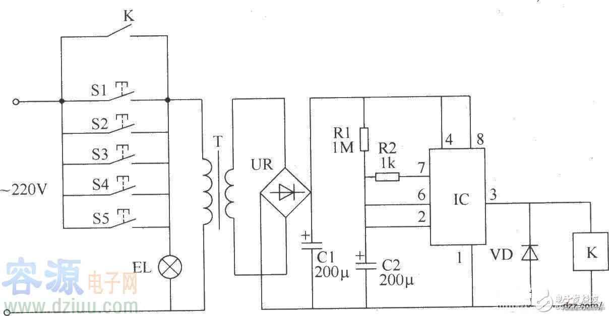 本例介紹一款具有延時功能的多地控制開關(guān),采用多只按鈕來控制一路照明燈。按動任一只按鈕,均可使照明燈點亮,3min左右照明燈自動