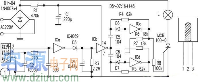 4069簡易紅外遙控開關(guān)電路圖。現(xiàn)在家庭中TV、VCD、VCR等紅外遙控發(fā)射器擁有量較普遍,本電路針對它們的性能而構(gòu)思,使遙控發(fā)射器發(fā)揮另一用途:發(fā)射紅外信號,控制照明燈具,其控制距離