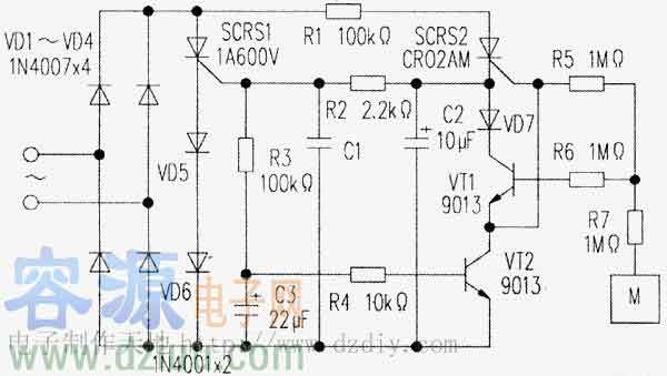 電路如圖所示。二極管VD1—VD4構(gòu)成橋式整流,可控硅SCRS1在電路中進行電源通斷控制。小電流觸發(fā)可控硅SCRS2實現(xiàn)觸摸開的控制,三極管VT1實現(xiàn)觸摸關(guān)的控制。平時可控硅