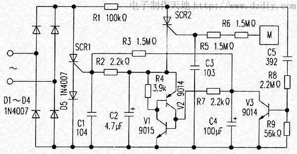 無靜態(tài)功耗觸摸延熄開關(guān).電路如圖所示。由于在圖中的R8處,串聯(lián)了一個耐壓400V以上的小容量電容C5,平時沒有任何靜態(tài)電流。每次SCR1導通的時候,此小容量電容通過R1、R8、R9放電,延熄結(jié)束后,220V脈動直流電向此小容量電容快速充電。由于V1、V2導通時,C4上電壓只有0.6V左右,要把C4上不多的電荷放掉,對于電容C5只要幾千皮法即可,圖中C5為3900PF/500V。