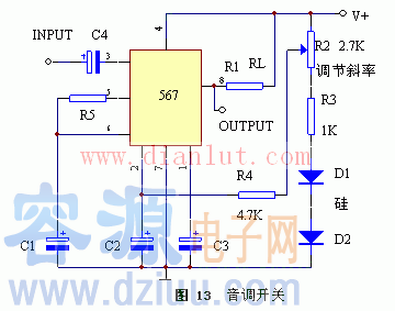 LM567為通用音調(diào)譯碼器,當輸入信號于通帶內(nèi)時提供飽和晶體管對地開關(guān),電路由兩個檢波器構(gòu)成,由電壓控制振蕩器確定譯碼器中心頻率。用外接元件獨立設(shè)定中心頻率帶寬和輸出延遲。主要用于振蕩、調(diào)制、調(diào)解和遙