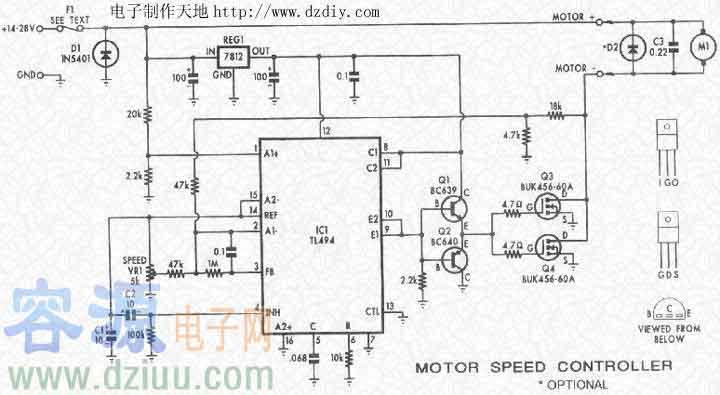 TL494搭建的PWM直流電機調速電路.下圖為使用TL494搭建的PWM直流電機調速電路.電路看起來復雜些,使用兩只場效應管并聯驅動輸出,可驅動功率較大的電機.