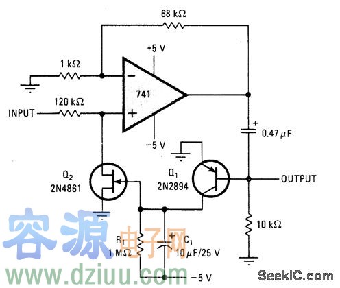 在741運放器的峰值檢測控制回路中,JFET作為電壓控制電阻。輸入范圍為20mV至20V,并且帶有1.2毫秒的響應時間和0.4秒的延遲。在60分貝的范圍之上,輸出大約1.4V PP。 :