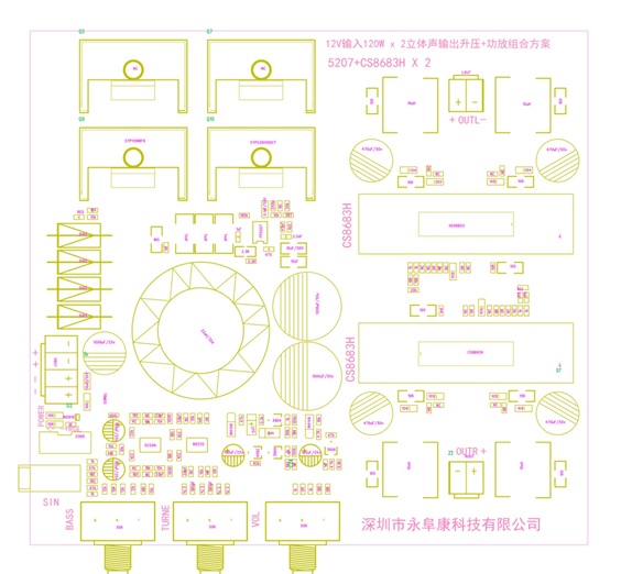2、采用CS8683兩顆大功率單聲道D類音頻功放IC(單聲道100W用一顆),30V提供2*100W/4歐 ( THD+N=1%)持續功率輸出;