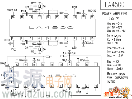 LA4500功放IC應用雙列20腳封裝;電源VCC=24V;允許功耗Pd=15W;輸出電流=2.5A;靜態電流=20mA;輸入電阻=30kΩ;輸出噪聲=0.4mV;電壓增益=48~52dB;諧波失真=0.3%~1.5%。