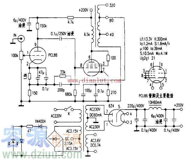 附圖是采用6n8P+EL156構(gòu)成的功率放大器電路原理,筆者這臺機器的