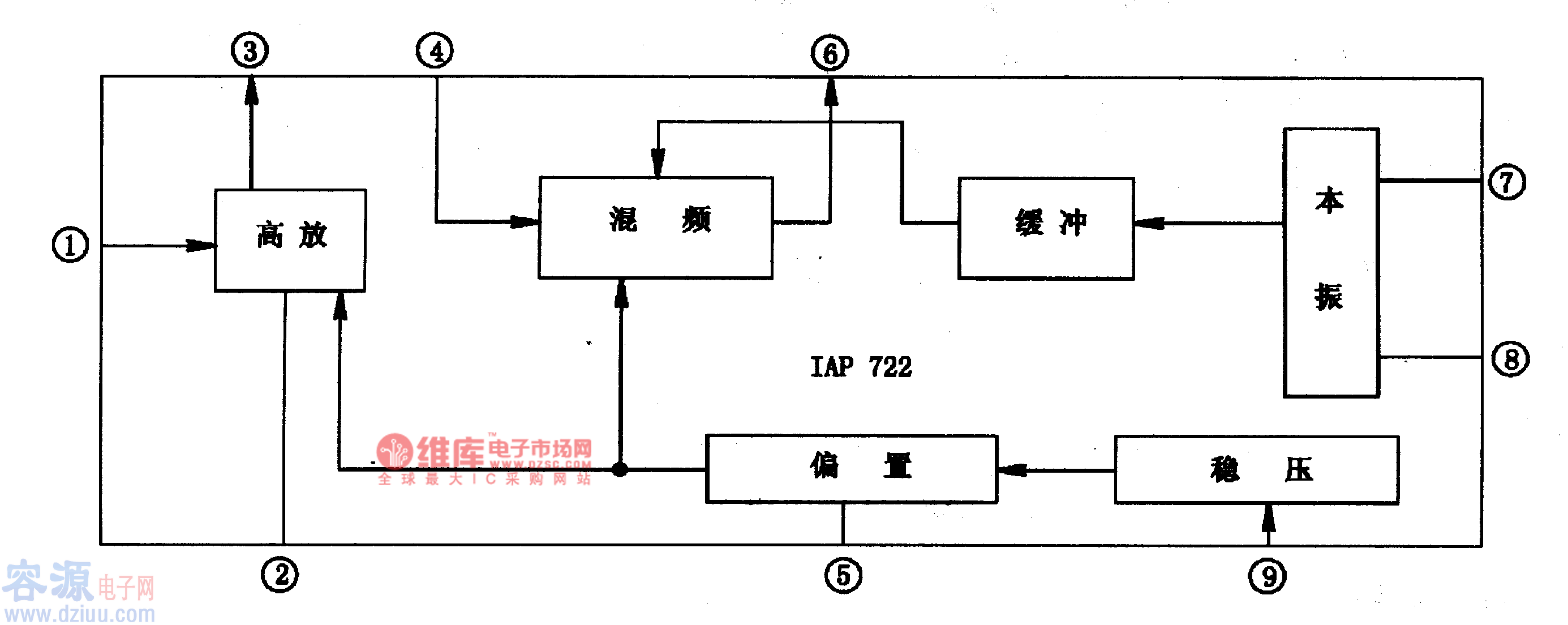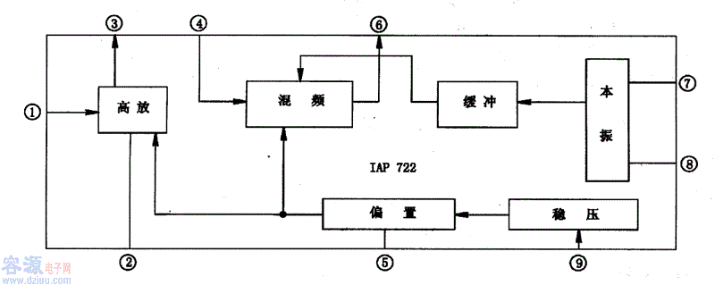 lAP722是一塊調頻高頻調諧集成電路,應用于低電壓收音機,隨身聽收放音機中。 1、lAP722內電路方框圖及引腳功能 lAP722集成塊內含FM高放、本振、混頻及緩沖放大等電路。該IC采用9腳單列封裝,其集成塊的內