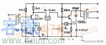 陶瓷濾波器收音機中放電路 如圖所示為兩端及三端陶瓷濾波器在調(diào)幅半導(dǎo)體收音機中放電路中的應(yīng)用。陶瓷濾波器B1和B2用于465kHz中頻旁路,B1則用于中頻的耦合。B1使用窄帶型濾波器,它并聯(lián)在VT1的發(fā)射極電阻上,有