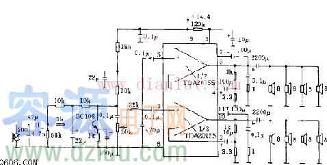 如圖所示電路,其工作原理為:本電路是采用TDA2005S雙低頻功率放大集成電路的公共汽車收音和擴音電路。圖中輸入端可以接話筒或收音機的低頻電壓放大輸出級。每個TDA2005S輸出10W功率,可帶4個揚聲器。兩路輸出可
