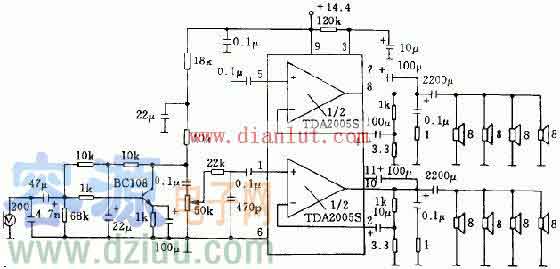 由TDA2005S構(gòu)成的200W公共汽車收音機和擴音機電路