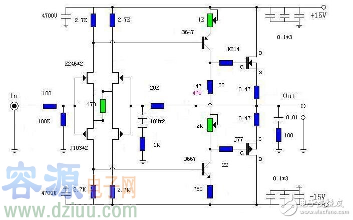 簡易的20W單端純甲類功放電路圖 如圖為簡易的20W單端純甲類功放電路圖。核心電路是由兩只BC559組成的差分放大電路,22K對地電阻為三極管的偏置電阻,它的大小同時決定了整個功放的輸入電阻。8.2K電阻是差分對管的