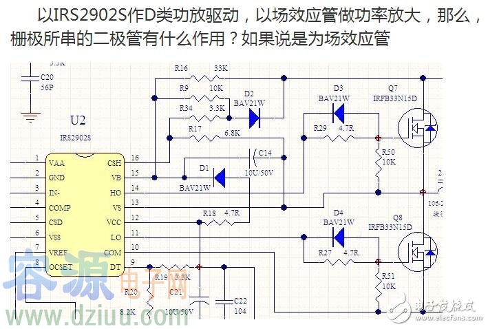 IRFB33N15D的VGS在3.0V至5.5V這間,實際驅動時,取決于IRS2902S的工作電壓,實際都在10V左右,肖特基二極管D3的正向壓降只有1.2V左右(電流1A,但其ΔV/ΔI約為0,動態內阻極低),已經可以確保Q7和柵極處于低于VGS以下,對關斷沒有影響。 另外,你要學習動態內阻的含義,如同電源,其壓降可能是5V,但其內阻可以低達十幾毫歐。