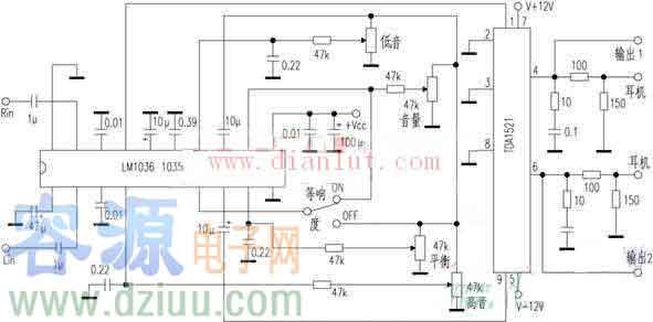 如圖所示是一款自制的用于多媒體的功放電路,圖中LM1036為直流音調(diào)控制IC,用于高低音、平衡、音量調(diào)節(jié)。功率放大為TDA1521,當(dāng)供電電壓為±12V、8Ω負(fù)載時(shí),即可獲得2×15W的輸出功率。電路采用萬用板焊接。須注