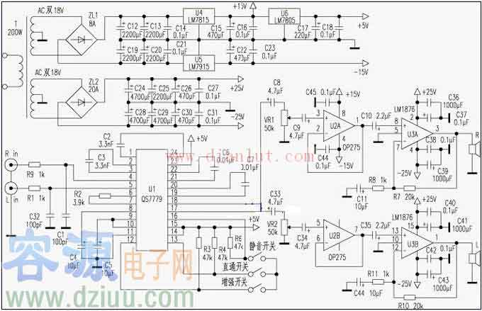 本電路相當(dāng)簡潔,音效處理采用加拿大QSOUND公司的單片QS7779虛擬環(huán)繞電路。由于該電路內(nèi)置了杜比定向邏輯和杜比數(shù)碼混合信號解碼器。不僅能使普通的立體聲信號進(jìn)行效果增強(qiáng),當(dāng)播放的是DVD的杜比數(shù)碼信號時(shí)也能