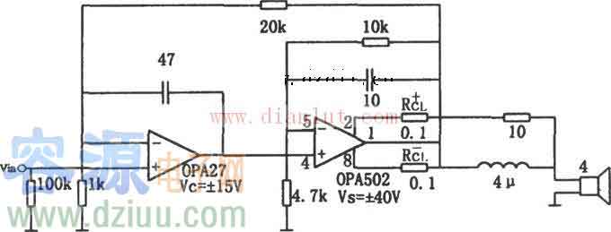 該高保真組合音響放大電路使用了超低噪聲精密運放OPA27作為前置放大。該電路最大輸出功率可達(dá)150W。OPA27采用同相輸入方式可提高其輸入阻抗,當(dāng)電源電壓為±15V時,其輸出線性動態(tài)范圍±12V。當(dāng)輸出功率為50W時