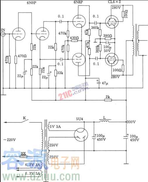 直熱式整流電子管燈絲抽頭高壓電路圖